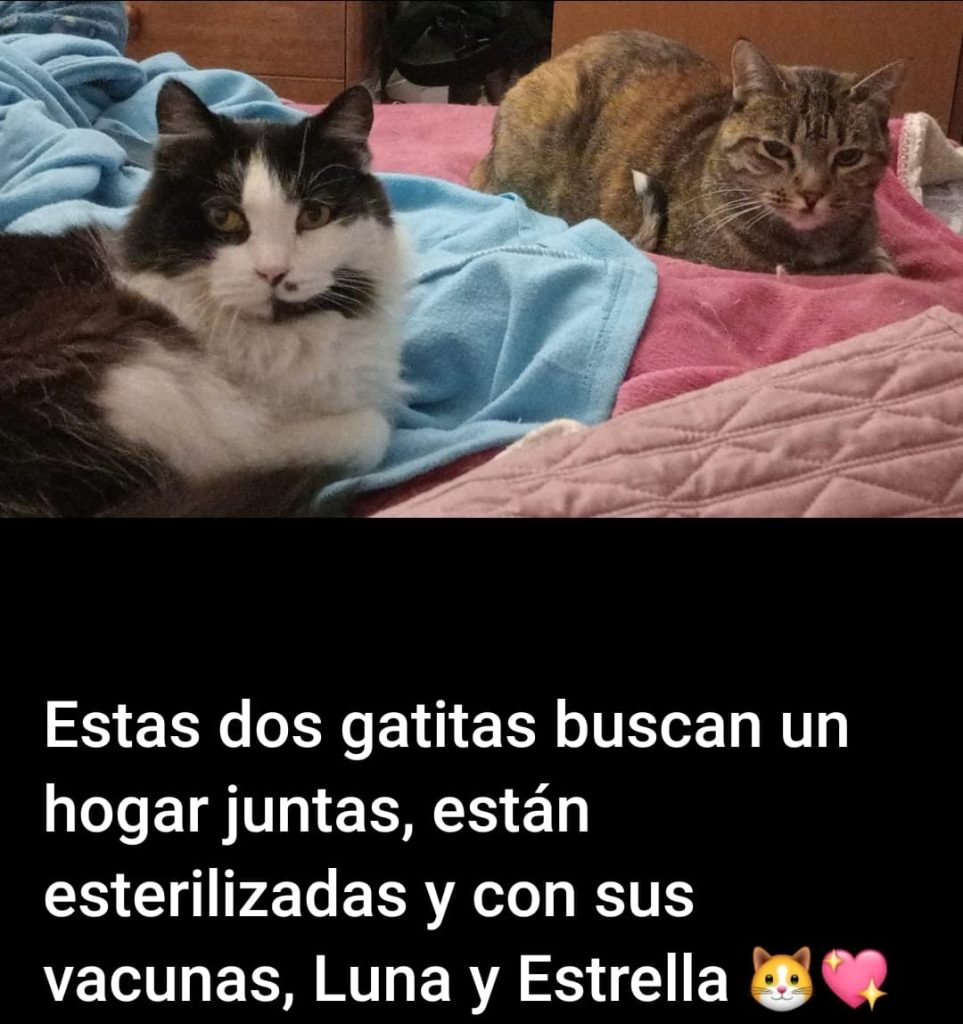 La persona que cuida a la hija, de la sra Mariela Anabalon (Quien falleció el 7 de Junio pasado) nos solicitó ayudarle a buscar un hogar a 2 gatitas, que la sra Mariela tenía como mascotas, estas gatitas estan esterilizadas y son hermanas, envio foto para publicar .